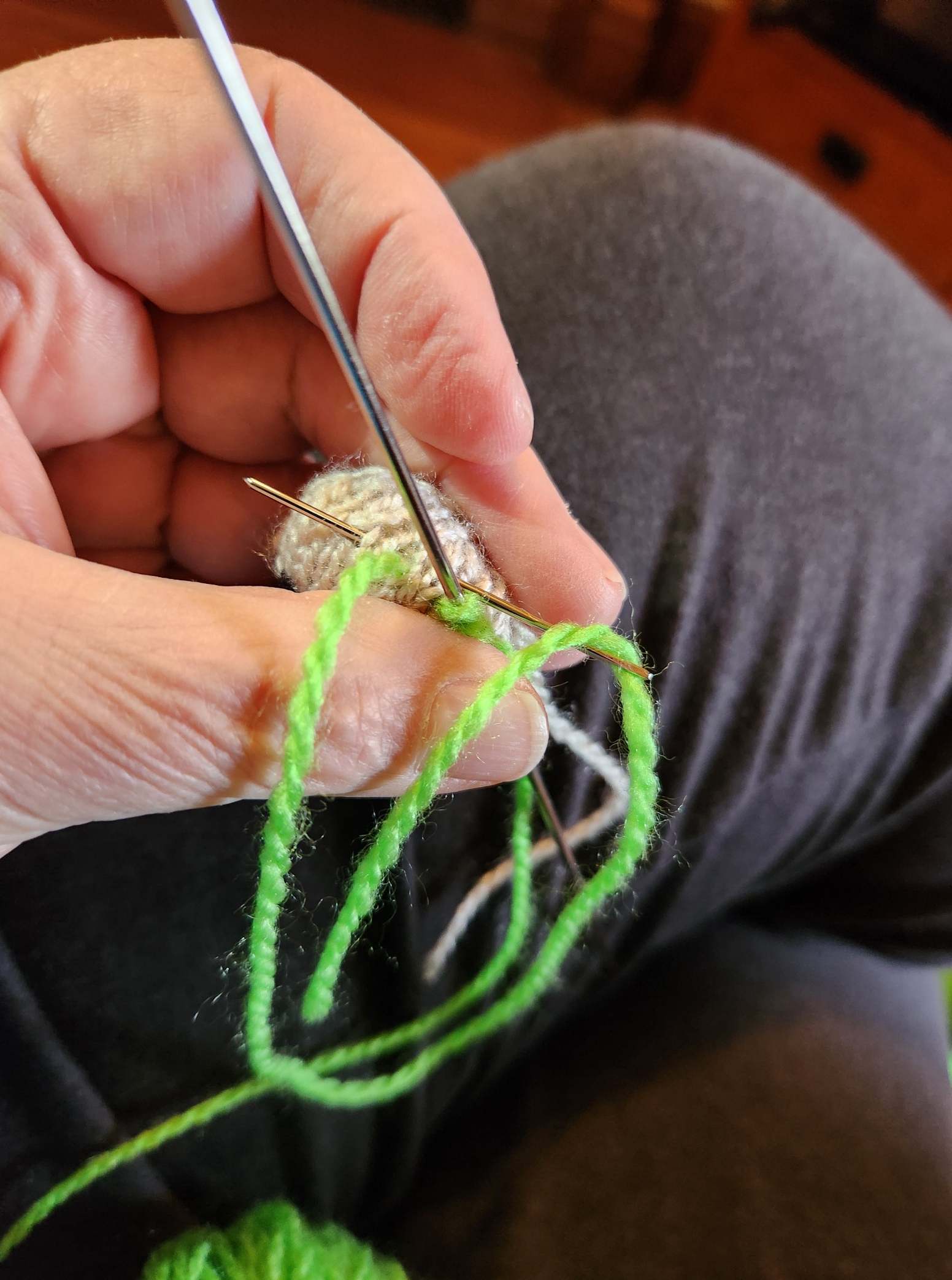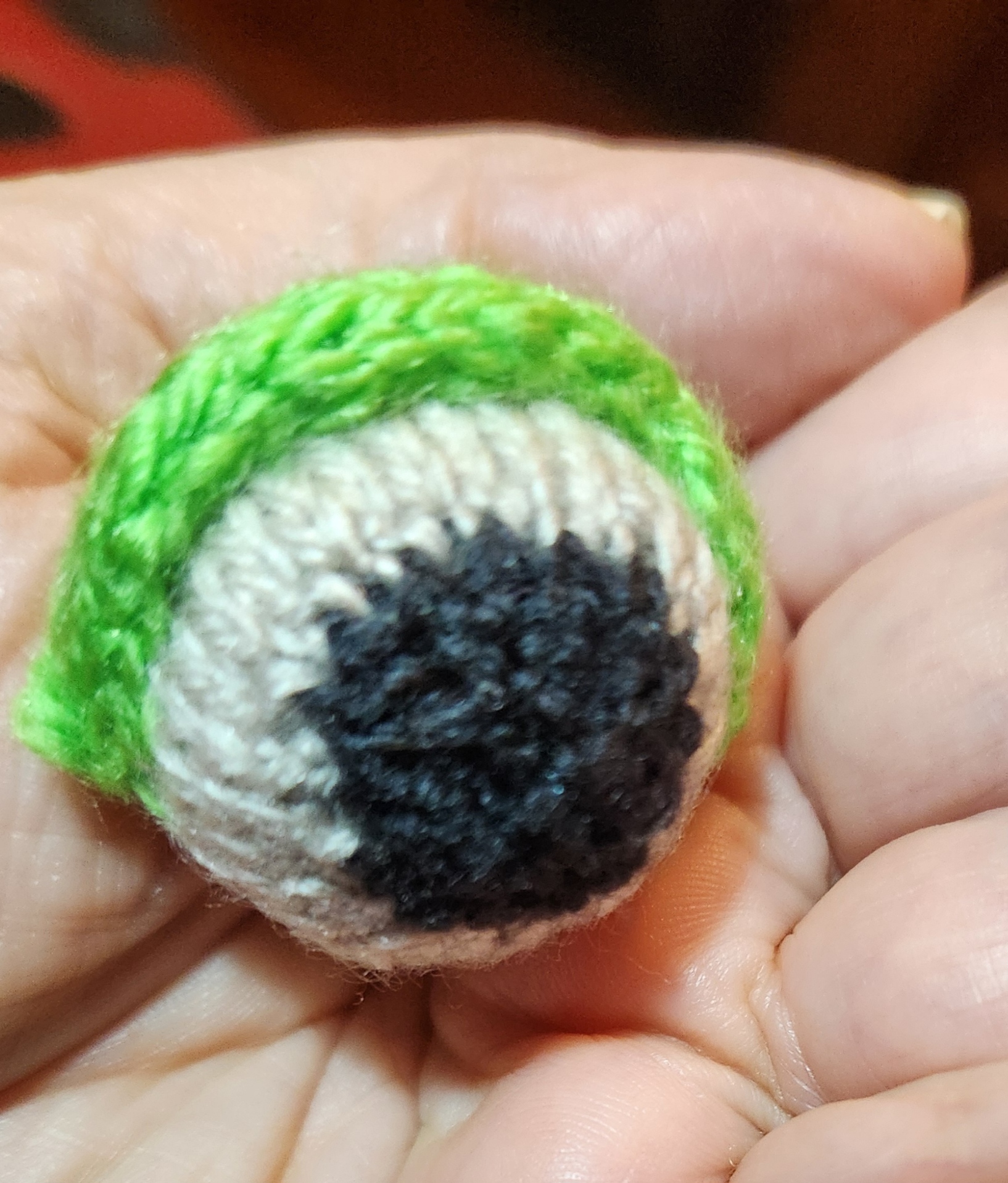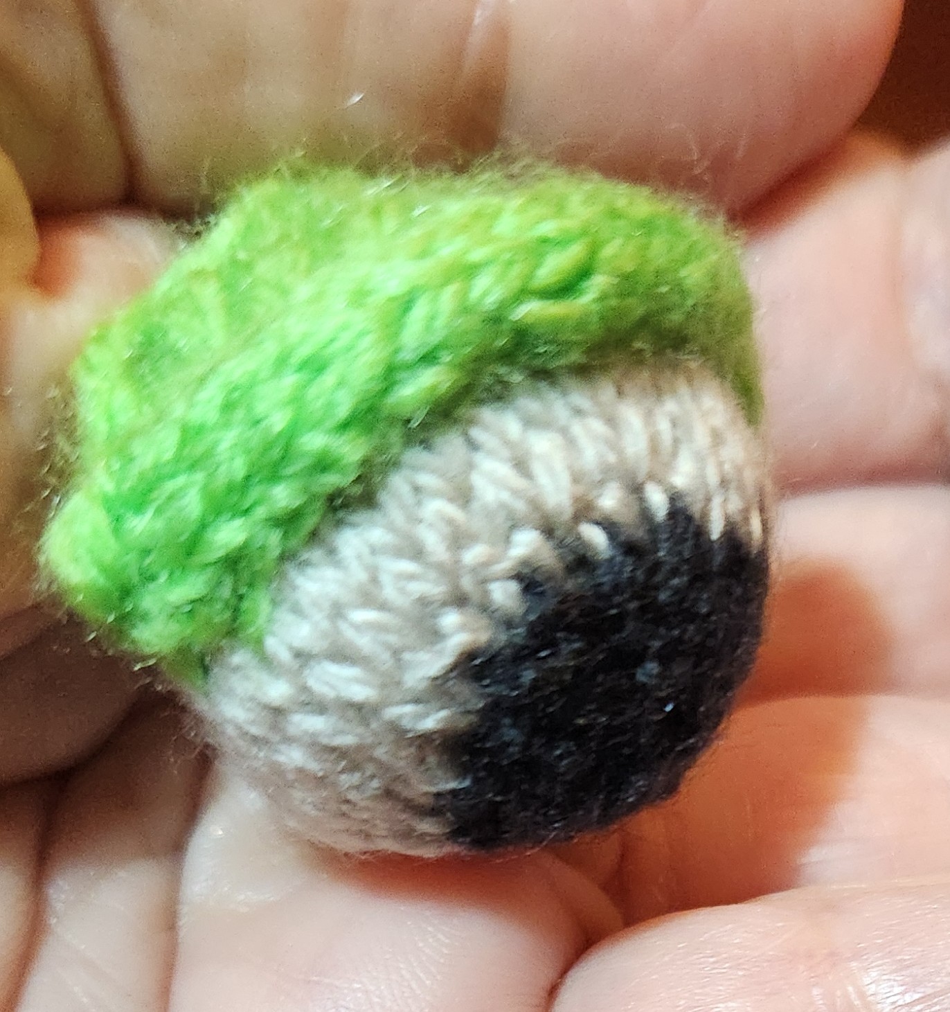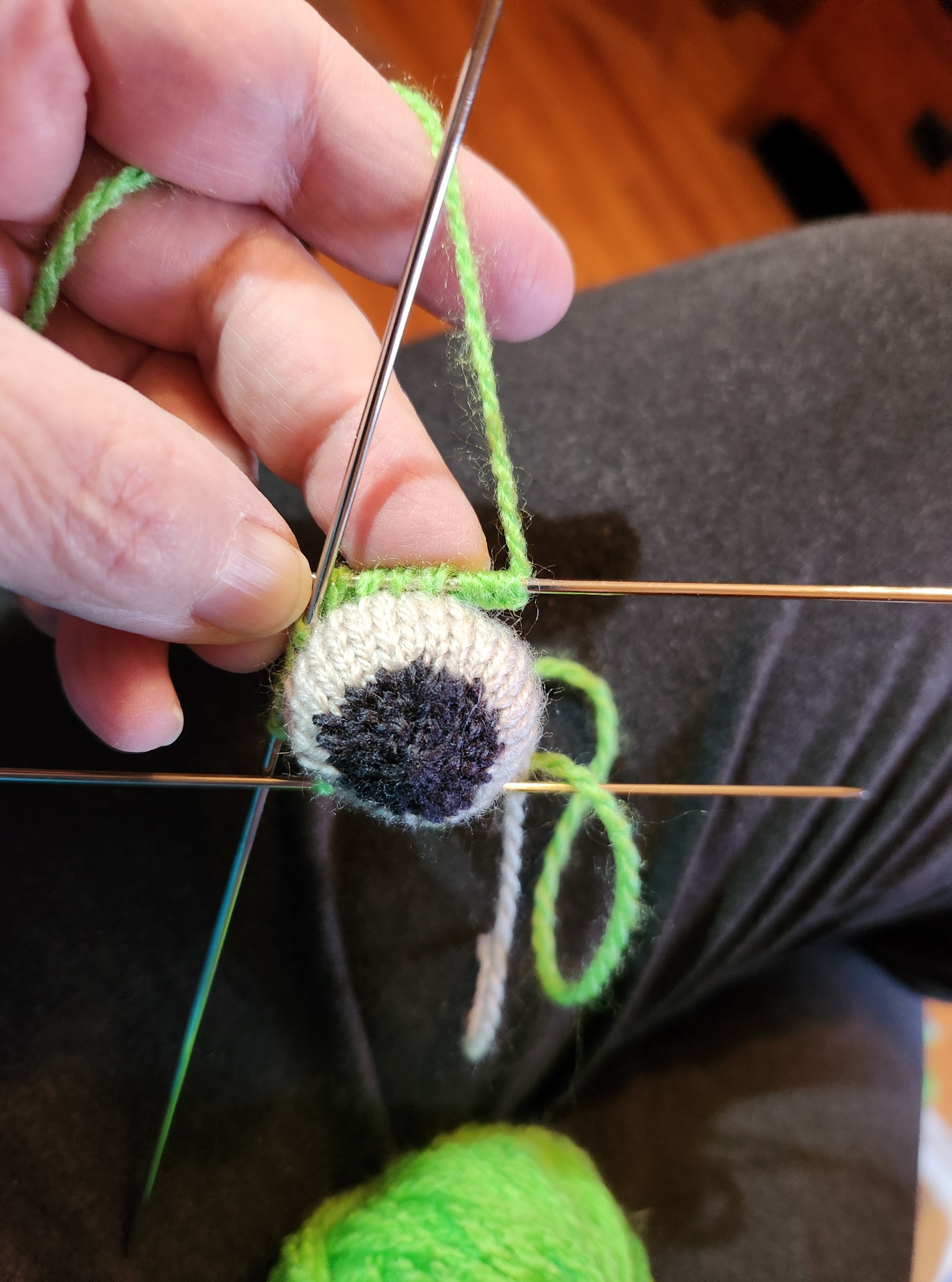 Once the little eyeball spheres were knit, stuffed, and ended off, I had to add eyelids. To do that I used a threaded needle and embroidered backstitch. I looped my backstitches over my DPNs to set up the foundation for a row of knit-on I-Cord. Three needles’ worth, five stitches each. I did this via sewing because picking up stitches across the surface of the eyeball was difficult to do without disturbing the stuffing.