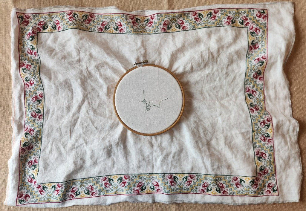I am working a doubled variant of the edge pattern across the center. Possibly flanked by two single panels. I haven’t decided on those yet. I want to capture the spirit of the original, a towel done in Punto Scritto and Punto a Spina Pesce MFA Accession 83.242, Italian, 16th century, silks on linen. The original is quite large, more than four times the size of my rendition.