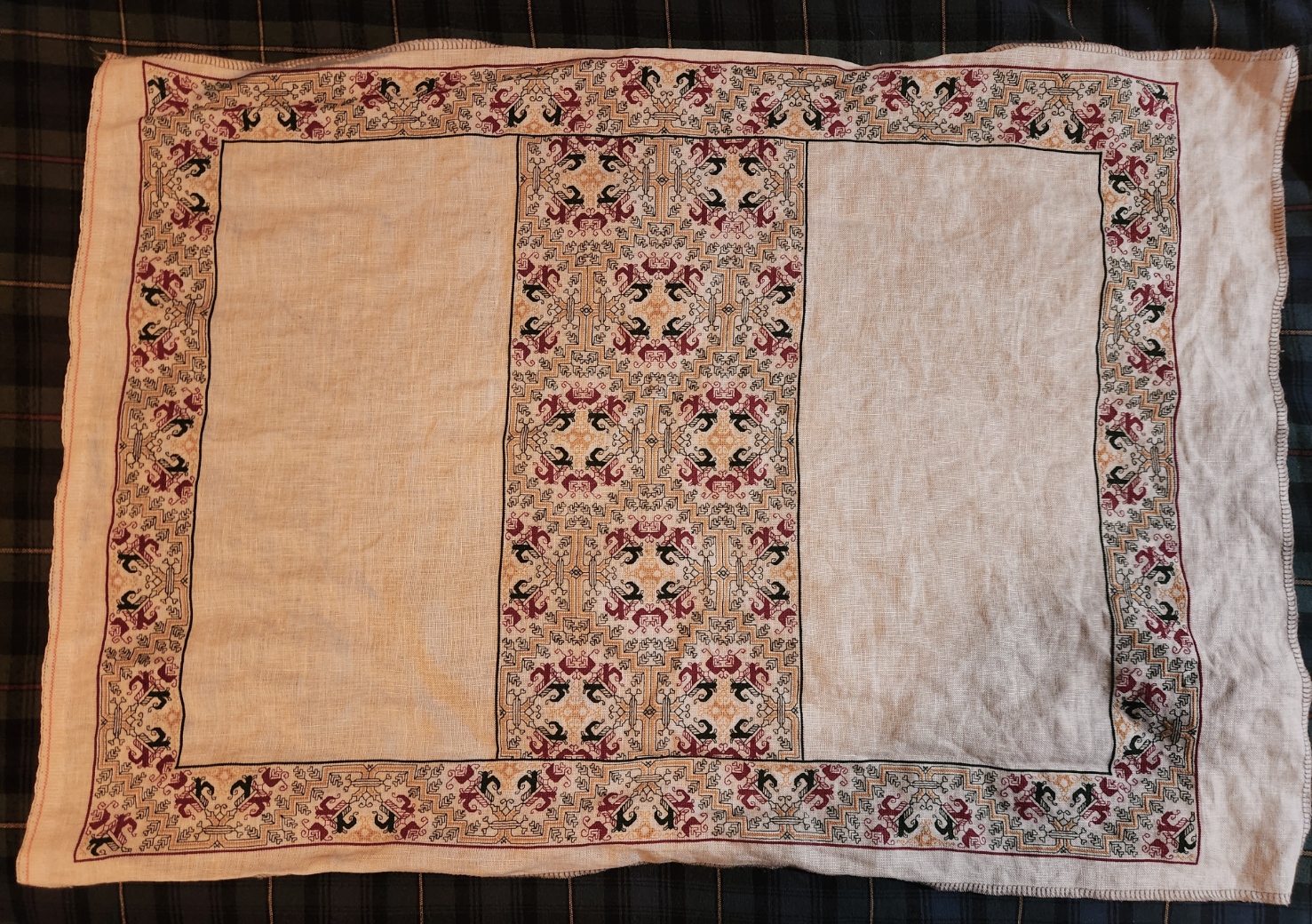 Examining those bars, I can conclude that they were done after the framing, and were aligned with the cloth’s horizontal centerpoint, because the band design is truncated (more or less) at the same point where it meets up with the frame, both north and south. But note that the centers of repeat along the long sides of the frame itself do NOT align with those bars, nor do they align with the measured center of the cloth. Again I bet you didn’t notice.