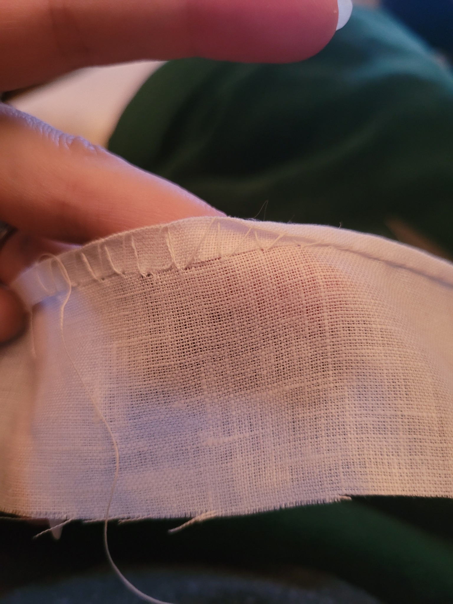 What I am up to now is the narrow rolled hem. I want to thank long-distance friend Rhaeya for posting a how-to photo of her method of hand-working a narrow rolled hem on linen. It’s far more efficient and easier than the method I learned from my Grandmother. Granted – the family method was predicated for use on chiffon and it came in handy for a wedding I attended decades ago, which required a bridesmaid’s dress with ruffled tiers of that stuff in light blue. But it didn’t work quite as elegantly as Rhaeya’s does for this heavier linen.