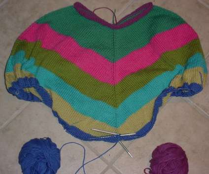 With luck, I’ll have just enough of the plum left over to do an I-cord edging. If not, I’ll rip back any completed I-cord and buy another skein. Even if the dye lots don’t match (which they probably won’t as I got the plum months ago), between the striping and the large visual distance between bits of the same color at neck and hem any differences will not be noticeable.