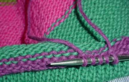 My goal is to preservethe currentrolledcollar as a welt detail,but fillin the loose-fitting neckline with a contrasting texture. Using plum, I’m going to pick up stitches in the purl bumps of the last row of thecurrent rolled collar, just before I switched from plum to the teal and began the body increases: