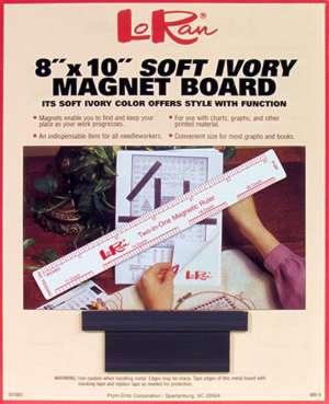 Lo-Ran appears to be the leading (perhaps only) outfit marketing these.Boards come in several sizes both with and without pencil ledges at the bottom. Theyare marketed in several bundles, some with additional accessories. Accessory packs are also sold separately. Mine didn’t come with the little white magnetic ruler pictured, but I bought it a zillion years ago. I also don’t use the magnifying bars, stands, or other supplemental gadgets. The half-barrel shaped magnifiers distort too much for my liking, and as a Wandering Knitter – the less impedimenta, the better.