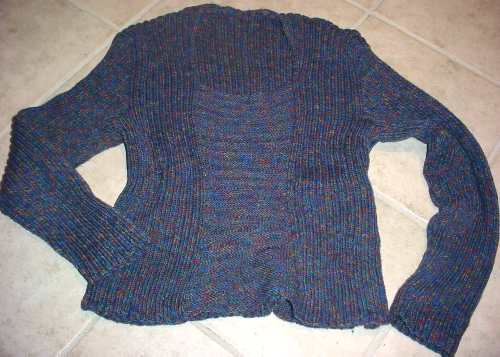 The yarnI used isjunk.The color is beautiful – a combo of deep blue with a ragg-type strand of brights twisted in. It’s wear-against-the skin soft and luxurious. But since knitting it has begun disintegrating. Without provocation (no moths, no mold, no laundry stress, no rough handling, no careless storage, and after only two wearings), spots here and there have broken. I’ve got a half-dozen safety pins in the piece right now, holding stitches to prevent them from laddering down. I need to find my leftovers and do some aggressive duplicate-stitch style darning, in effect Kitchener grafting the broken bits together. I’m especially annoyed because I had no clue this would happen as I was knitting. Grrrr.