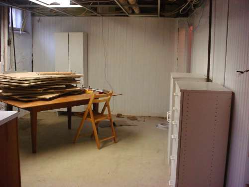 This is the spare room in the basement. It’s a former summer kitchen/laundry room. There’s a plastic?tub sink just to the left of the work table. There’s also a recycled kitchen countertop?with a?shallow dish sink, the corner of which you can see just peeking out on the right. The three white storage cabinets are Home Depot $19.99 specials that (miracle of miracles) managed to survive our move. The table is a legacy from the former occupants. There are two gas lines – one on each wall. Plus some dismal dropped ceiling panels (stacked on the table but shortly to go back up), grungy linoleum flooring, and ancient beadboard paneling, painted sloppy white to cover pea green some time during the Eisenhower administration.