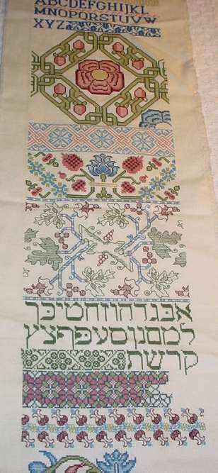 You see about a third of the total length. The rest of the piece includes a bit of inhabited blackwork; plus another standard Roman alphabet; and lots more cross stitch and strapwork patterns. Some day I might finish it. Or maybe not.