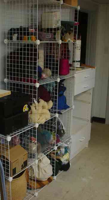 The stuff in?my cube unit isn’t there for any particular reason. Mostly it was miscellaneous knitstff that got packed separately from my storage tubs. There’s my swift and ball winder; my collection of single-malt Scotch containers housing needles and other tools (upright on the white dresser, and horizontal in a top cube); various UFO bags; a stack of some rustic-type wools that in violation of my own stash-management rule, has overflowed it’s allowed tub. My small black box of sock yarns; and various coned oddiments. I believe that cone of raspberry is in fact Believe, a find from the Classic Elite mill ends outlet up in Lowell, MA. Books, mags,?and leaflets are elsewhere in the house, in their own bookcase; with mags and leaflets?sorted more or less haphazardly into several plastic magazine files.