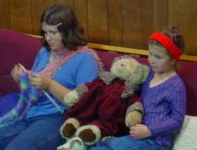 Here we see the two of them. The older one is wearing her frist scarf and working hard on the second. The?little one is wearing her first product – ?an earwarmer band. Somehow, even afternoon TV doesn’t seem so evil if they knit during the cartoons.
