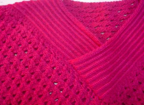 This item is proof of his expertise. Magenta?? Who can wear something that loud?? It turns out that I can. The yarn is Brown Sheep Lambs Pride. I knit this around ’86 or so from an Aarlan pattern appearing in one of their large-format magazines – possibly from that year’s fall or winter issue (I haven’t found the box with it yet, otherwise I’d be sure).This is?a case where cross-materials substitutions worked well. The original pattern was done in a linen/silk combo. The?yarn?was a very expensive yarn that would have cost me easily five times what the Lambs Pride did. I would never have thought of so drastic a departure back then.The gauges however matched, the wool showcased the texture stitches brilliantly, and the piece just clicked together with no problems whatsoever.