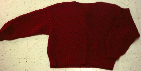 The neckline was also done in an unusual manner that was very common on Aarlan pattens of the time. The back of the piece is bound off straight across, with no shaping or edging whatsoever. The front is worked leaving a very wide Vee. Two strips of ribbing are worked as separate pieces (with slip stitch selvedges for neatness, since they show), and are then sewn on to the edges of the Vee, overlapping at the bottom point. It’s an unconventional treatment, and one I was afraid would pose problems of durability, but as you can see – this sweater is still going strong almost 20 years later.
