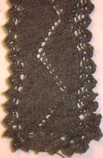 My gauge over my Kombu is K1, P1 rib is roughly 6spi , on US #4 needles. This gray scarf is about 6 inches wide, measured point to point. I’ve completed about three feet so far, averaging about eight inches per hour. Both the center pattern and lace edges are quick to memorize and knit. Alternate rows of the center are K1, P1 rib; alternate rows of the edgings are all knit. Because the scarf is based entirely on a combo of ribbing and garter stitch it lies absolutely flat, without curling.