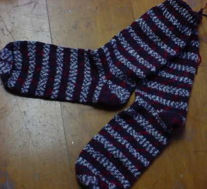 I knit these Saturday night from Lion Brand Magic Socks, while watching Present #1 below. These socks are worked at 7spi/10rpi on 2.5 mm needles (in between a US #2 and #3). The yarn is serviceable enough – a standard wool/nylon blend sport weight as opposed to fingering weight sock yarn. The color patterning is pretty uninspired compared to most. I get two speckled fake “Fair Isle” sections in this repeat, one in gray and white, the other in red and black. The entire repeat cycles in about 1 inch. Not terribly exciting, but at $7.00 US per 100g ball (enough to make up to about a man’s US size 11 shoe) – a very good value.