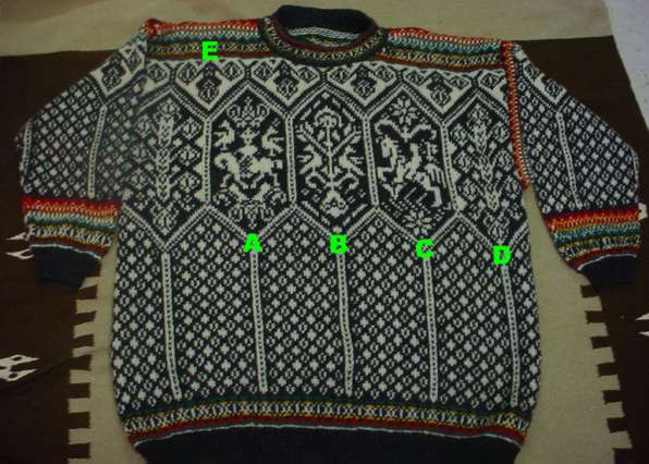 That’s about all the figural elements I can pick out from the design. The rest is just generally decorative. I do however particularly like the use of the close color banding at the top and edges. It looks reminiscent of tablet weaving, in a geometric that wouldn’t be inappropriate for before 1000AD. Likewise with the lozenge framing mechanism and brocade-like voided and filled dots. That’s not to say that knitting of this type was done back then (it wasn’t); but the style of the ornament on this sweater echoes weavings and textile decorative composition of a time when worship of these deities was widespread.