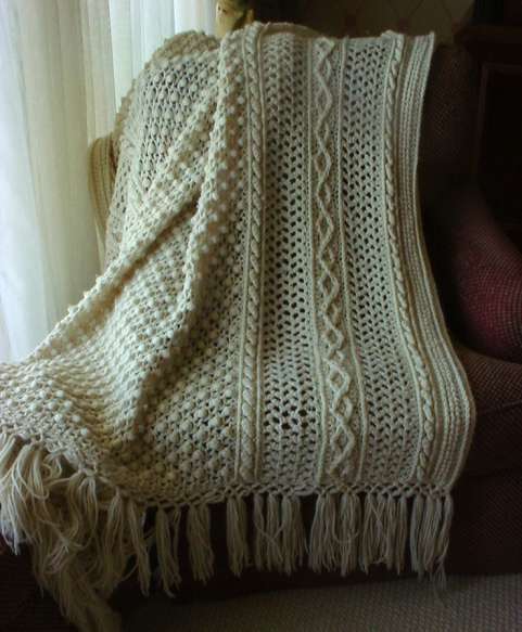 Well, sort of. Actually I took the poncho pattern in this booklet, expanded it a bit in both length and width, adding extra panels of texture stitches, and edged it with a two-knot macrame fringe. (I tinkered with patterns even before I started knitting). It ate yarn. Crochet uses more yardage than knitting to make an equivalent sized piece. The finished blanket weighs a ton. Even though crochet is usually faster than knitting, it took a long time to make. See those fake cables? Those were done as little semi-detached bits, anchored at the tip several stitches away. The solid parts were panels of slip stitch or single crochet. The narrow, wandering cable was applied slip stitch worked after the piece was finished. The bobble section took forever and a half to finish. I can safely say that I haven’t crocheted a bobble since.