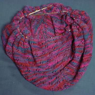 I’m past the center part now on the Paisley Shawl, and have finished the dividing section of K2, YOs. I’m pleased with it so far, although it’s tough to see well wadded up as it is on the circular needle. Still, you can make out some details if you squint at this: