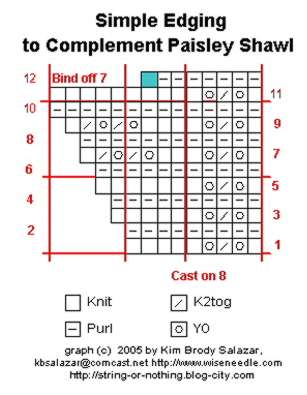 One important thing to note is the difference in the quad eyelet motif. I thought about it some more as I sat in traffic during yesterday morning’s commute. In the shawl body, that motif is presented in plain old north-south orientation, with the rows running horizontally. The motif spans six rows and begins with a single eyelet on the first. In the edging, the repeat is presented on the bias. The motif wouldn’t show in the same orientation. Plus the extra stitches added to form the repeat skew the stitch count. Therefore working the repeat as shown yesterday would not make a quad-eyelet design comparable to the one in the body. If stitch placement were adjusted, it would make a square of eyelets instead of a diamond. Unadjusted as is, it would make a snaky looking blob of eyelets.