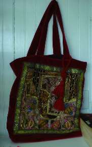 The red velvet one covered with embroidery and bits of wedding saris is beautiful and capacious. It was also a highly appreciated gift. It’s extremely fragile, as the sequins and jewels have a habit of shedding. Plus it’s very floppy. Too beautiful and too delicate to schlep around, this one lives in the living room, lounging around on display and holding my upstairs project of the moment. (Yes, I have different projects in different rooms, and often work on what’s closest rather than my primary project.)? Gorgeous, but a B- mostly?for limited utility.