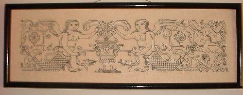 This is one of the pieces I entered in the Woodlawn Plantation embroidery exhibition over the years. It won an honorable mention prize (feedback was that the judges didn’t like the skewing of the repeat). Amusingly enough, my brazen, bare-breasted mermaids must have offended some sensibilities. The piece was displayed at the very top of the wall in a room with 15-foot ceilings. The prize ribbon was clipped athwart the bosom of one mermaid, and a yellow sticky note was affixed to her sister’s.