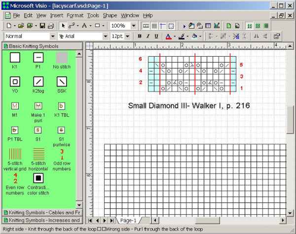 Yes, I know that there are whole companies that do nothing but sell Visio template solutions, and here I am giving one away. It’s “teachware.” If you use it, teach someone else how to do something (especially something knit, stitch or fiber related), and I’ll consider myself well paid. You may use my templates to create original knitting and stitching charts of your own. A credit for the tool would be nice if you publish any of the resulting charts, so that others can find it and use it too. You may not however repost these templates on another site nor may you claim them as your own. (If you do, major demons of vile vengance will haunt your dreams forever, should your kneecaps escape me and my trusty stick.) Linking back here is fine and dandy.