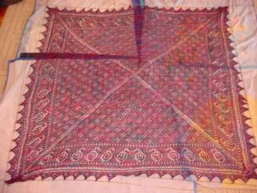 - Paisley Shawl – I started with some lovely hand-dyed multicolor lace weight yarn and Sharon Miller’s Birds Eye shawl pattern, but found out that the color variations in the yarn were too fierce and overwhelmed the delicate texture of that design So I began experimenting and looking around for alternatives. I found that the simpler the pattern and larger the plain stockinette (or garter) area, the better texture patterns coexist with color riot. I ended up working a mostly-garter pattern from Spring ’05 Interweave Knits. It’s an easy project, suitable for folk who are just embarking on lacy knitting. My Paisley turned out quite nicely, and became a much-appreciated gift.