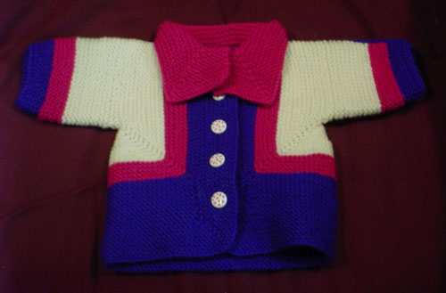 I think that the proportions of the thing look a little off. If I do another, I’d make it wider across the body. The sleeve width and depth looks o.k., but the body diameter seems a bit skimpy, especially when buttoned. I’d probably do this by adding a few stitches to the center back and to each side prior to starting the sleeve increases.