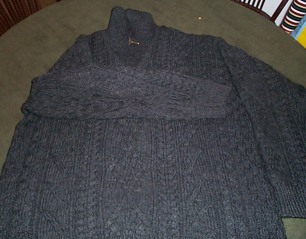 The sweater is of good quality, rustic finish wool. It looks like it was knit from two strands of sport or guernsey weight. The seams are machine-sewn, and there’s a nice “commando collar” – double thick ribbing, inset in a V, with a low turtleneck finish and center zipper. I’m not a machine knitter, so I’m not really up on what can and cannot be done using one, but the cables are not deeply embossed. They’re all formed by traveling stitches rather than multiple-stitch cable crossings.