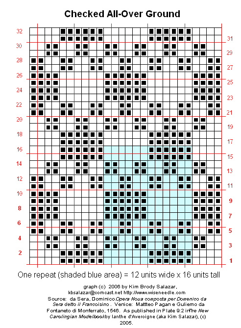 I don’t think this particular one is great for the hat, but I have an odd fondness for it, plain as it is. As the source annotation states, it’s one of the patterns I included in The New Carolingian Modelbook. While it looks like it would be at home as a border on the wall of a 1950s era tiled bathroom, it does in fact date back to 1546 by specific annotation. It may well have appeared elsewhere, although most of the da Sera patterns are pretty unique to his books. (If you think pattern piracy is rife these days, you’ll not be surprised by 16th century publishing ethics).