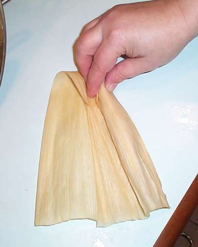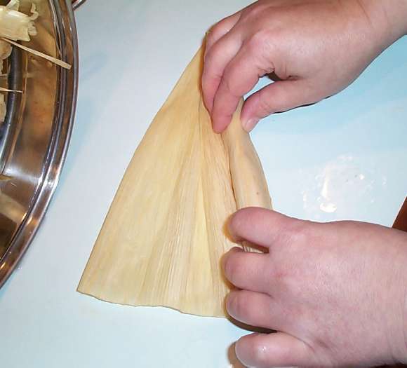 When you’ve got it mostly enclosed, stop rolling and fold the pointy end of the husk in over the growing roll.