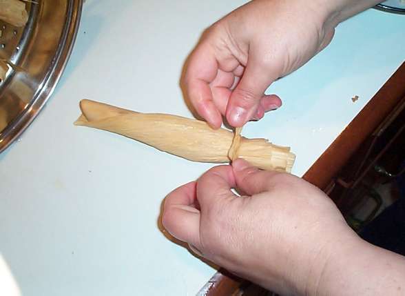 Continue rolling to make a little log with one end tucked neatly away. Now take one of the substandard corn husks (there will be some too shredded or narrow to be useful). Rip off a thin strip and use it to tie the open end securely closed.