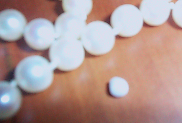 I’ve put my tiny pearl next to a strand of cultured pearls for size comparison. I’ve joked about finding a pearl, and have known it was remotely possible. But I’d never heard of anyone actually finding one. So what to do with my inferior but extremely lucky pearl? Wear it for luck, of course. I’m thinking of getting a tiny silver charm in the shape of a cage to keep it in.