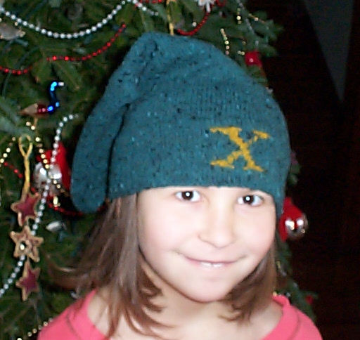 My forager’s hat is finished – a nice big modified stocking cap with a blunt end and a double-thick self-lined brim (no ribbing). The only thing left to do is to find out if my re-enactor pal wants the optional big honking tassel at the top or not. Here you see it modeled by Smaller Daughter. This is really an adult size hat. It’s not stretched at all on her head.
