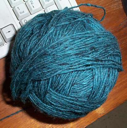 My yarn has quite a bit of slubbing, and looks like the color was produced by aggressively combing together black and teal dyed fibers prior to spinning (some of the slubs are clearly one or the other color, others are blended). It’s not bad, but it’s not uniformly good, either. The staple is short and the twist is uneven. As a result it breaks easily. The good news is that it also splices easily. In terms of weight, it counts out to 15-16 wraps per inch, which lands it in between fingering and sport in weight.