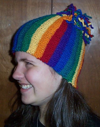 Modeled here by a slightly deranged looking Older Daughter, the hat is a very simple project to knit, but a rather fussy one to finish. It’s knit sideways. Each color is introduced leaving a very long dangling tail, and ended in the same way. There is no shaping, just welts formed by alternating bands of stockinette and reverse stockinette to make a wide rectangle. After the rectangle is finished, the cast on row is joined to the cast-off row. The dangling strands are knotted two by two, then all are twisted and gathered to make a very big single top-knot, forming the closed end of the hat. Finally, using a crochet hook the dangling ends are dealt with, turning them into the crocheted chains that make up the mass of tentacles tassel at the top.