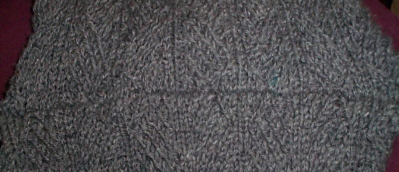 I know the pix are blurry, but I’m hoping you can make out that I’ve managed to match the design elements on either side of the seam. My ribbed leaf texture has a distinct center line for each repeat. Also the front and back ended on the same row of the texture pattern, making direct matching a bit easier. Each piece was bound off at the shoulder. I then butted the two shoulders up against each other and did a stitch-for-stitch-style seam into the stitch immediately under the bound-off edge. The two edges ended up being turned back like selvages. They are however useful, providing seam stability and resistance to stretch. Grafting the two shoulders together as live stitches without the reinforcement of the shoulder seam could lead to distortion of the shoulder region, as the weight of the garment pulled it down. Plus, as a modified dropped shoulder piece, the weight of the sleeve would also tend to distort that area.