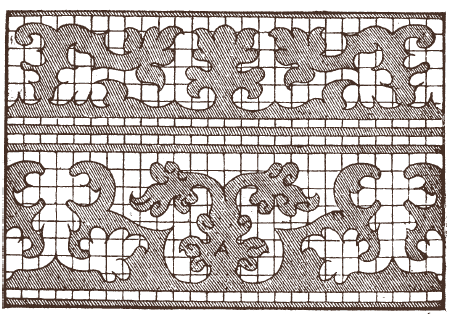 These are two modelbooks of the 1500s. There are several others in the collection, but they are mostly books of needle lace designs. Ostaus also offers up mostly patterns for the various forms of needle lace, plus some patterns that can be adapted to free-hand (as opposed to counted) embroidery, plus a large section of allegorical plates to inspire stitched medallions, slips, and cabinets. One thing I’ve always liked are some of his negative/positive patterns. These are designs that if laid out on a strip of thin leather or paper and cut can be separated longitudinally into two identical pieces. There are several of these scattered around the middle of the book.