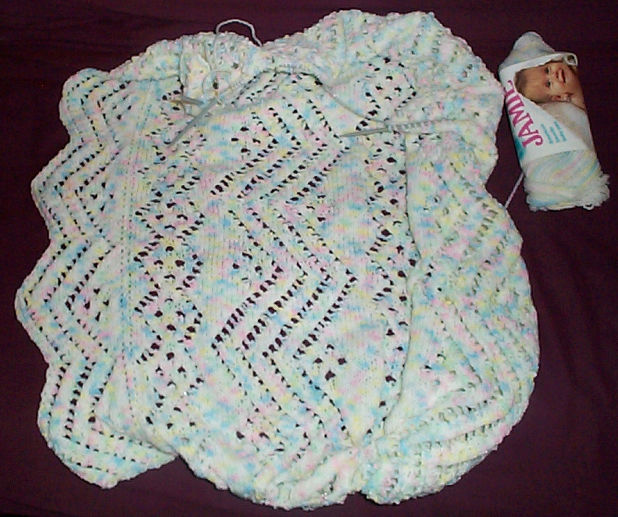 On to the next baby gift – #2 of 4. At the same LYS mega-sale where I got the fuzzy, I also picked up some Asa Gjestal Spinneri Baby Superwash in a light turquoise. It’s marked at 28 st = 10 cm, about 7 spi, but feels comparable to Dale Baby Ull. I could do a strip or medallion blanket throw out of it, or I could work up a sweater and hat set. Not sure. I’ve also got a couple of lots of soft acrylic at worsted weight given to me by a friend. There’s enough there to make a couple of blankets, too – one pale yellow, one pale blue, and another white with flecks one similar to the one I did back in the early Spring: