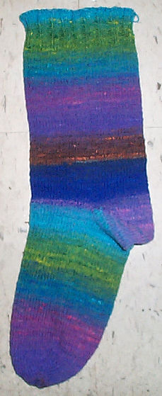 Why do a slouch sock? Between the wild colors, thick/thin spin, and overtwist, any lacy or texture pattern would be lost in this stuff. Also this yarn isn’t a good candidate for stranding or striping with another (although two different but closely related skeins in a simple stranding pattern might be interesting). I’ve had some breakage, and I’m not inclined to use this stuff for a nice, snug sock that takes a lot of stretching to put on. The roomy top will diminish that strain.