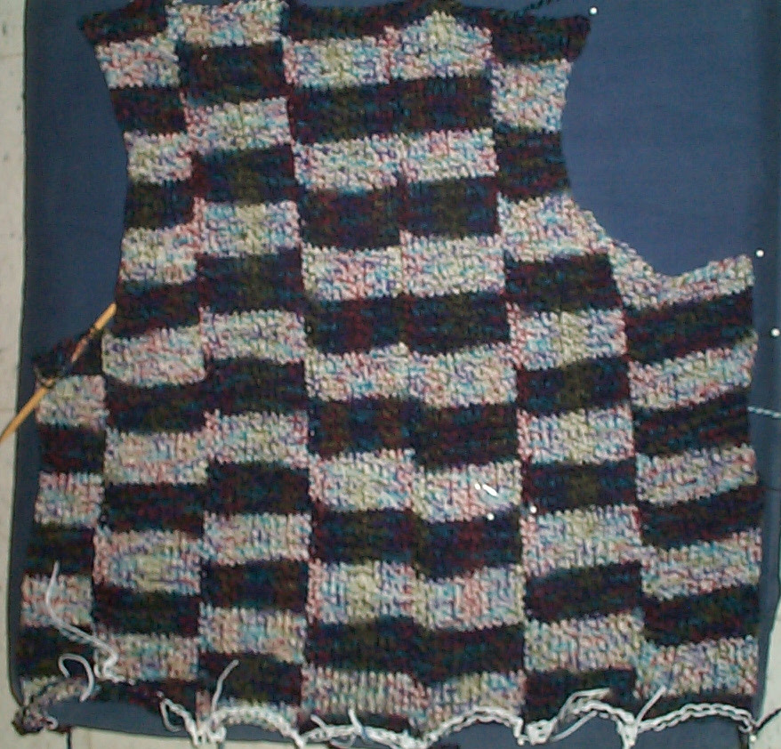 I like the haphazard arrangement of stripelets – that some almost align and others are flat mismatches with their neighbors. Working this yarn in strips is very quick. The fabric is quite nice, too – very light yet opaque. I’m on my third ball, and as you can see, am about 80% done with the back. At this rate I should have just enough yarn to finish the main pieces, although I may still need a contrasting yarn for the ribbings.
