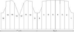 I used Sweater Wizard to produce a simple pattern for a flat knit saddle shoulder V-n`eck pullover. The directions include a schematic, and describe a front and back each worked separately. I divided my total stitch count into 8 equal “slices” for the back and 8 equal slices for the front.