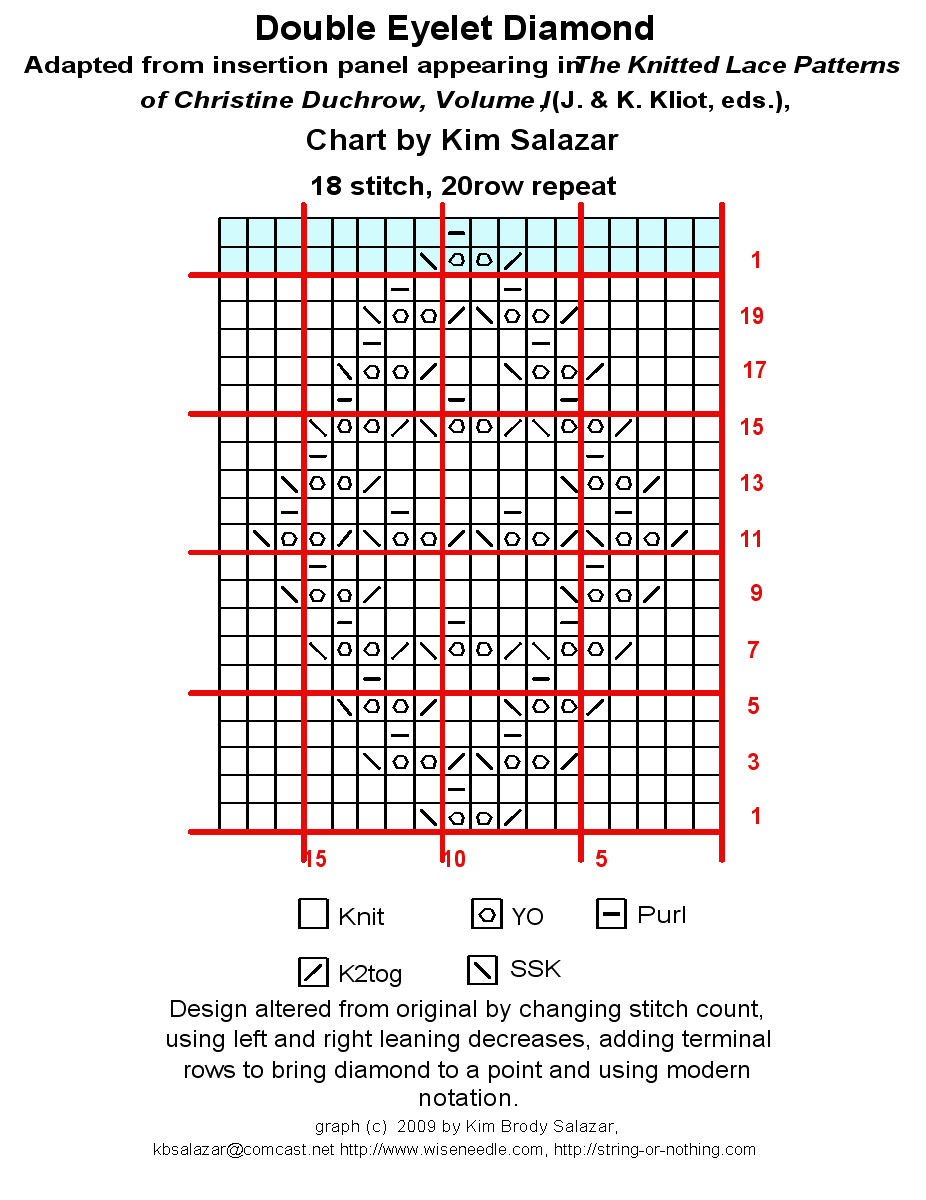 This adaptation is so blindingly obvious that it must be presented in other stitch sources. For example, without running to my library I am pretty sure that Walker presents a diamond of double YO eyelets in her second Treasury. Which is another way of saying that there’s little new in knitting, and most invention is more of a process of rediscovery than virgin creation.