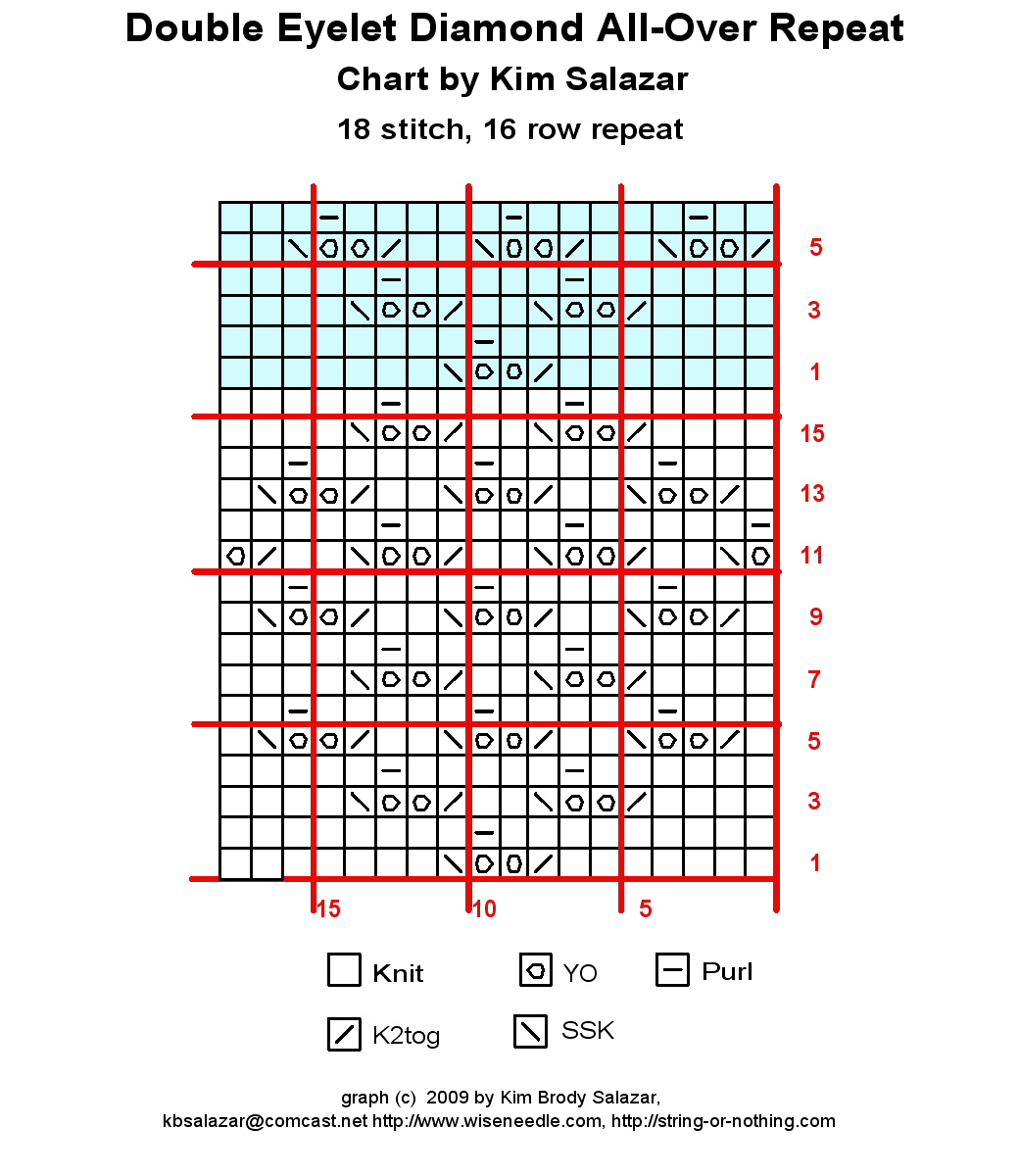 Or if you’re adventurous, here’s my own riff on the same idea to make an argyle-like diamond studded all-over repeat – this time requiring a fixed multiple of 18 stitches (It can also be worked as a single panel of 18):