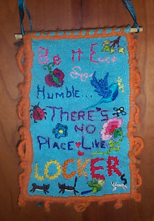 I stitched my sad little sampler partly for fun, and partly to poke fun at the overly elaborate, overly girly, just plain over done lockers of my peers. I don’t remember if the other girls thought much of my embroidered commentary, but I do remember a couple of teachers coming by and asking to see the thing, then convulsing with laughter. And seeing it each day jump-started my mornings with much-needed sarcasm. Subversive stitching in 1968 from a sardonic pre-teen.