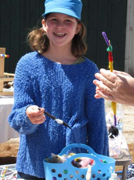 I’ve got an eye bending, giant lump of black Jaggerspun 20/2, elder daughter’s buying the same thing in screaming russet. (She’s thinking of doing a Paisley, but that thought is still quite larval.) Even younger daughter got into the spin of the day, making a felted snake at the American Textile History Museum‘s booth: