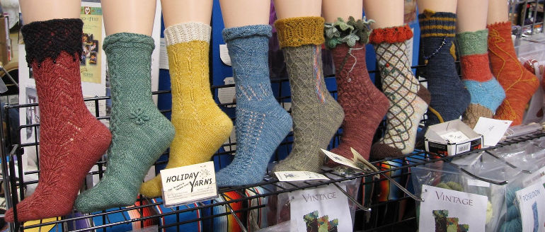 But back to the vendor displays. As I wrote earlier, I was especially taken with the creativity of the Tsock Tsarina patterns, on display at the Holiday Yarn booth. I’m not quite sure how I’d wear or care for these art object socks, but the exuberance and detail of these designs are fantastic. And I enjoyed the opera theme of the entire line: