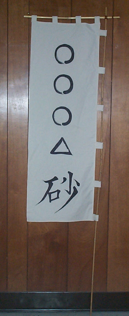 Today we did it. We made a beach flag inspired by the movie. The movie banner says “Farm,” but in our case “Sand” is more appropriate, because we intend on flying this on our annual Cape Cod vacation. Calligraphy for “sand” is courtesy of Ted Goodman and family, local Aikido instructor and all around good guy. (Thanks again, Ted!)