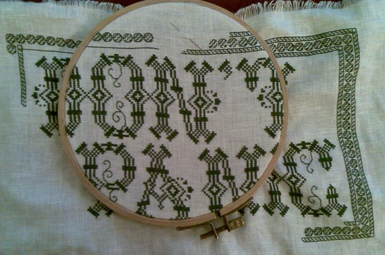 Well, I’ve decided to do a border around Don’t Panic. Again it’s one from TNCM, or rather, two that are presented together in the book. The first one is a very narrow geometric strip, the second is a bead (I think it looks like a march of panic buttons). The pattern is one of my originals, heavily inspired by historical sources, but not a literal transcription of any one design. The book doesn’t present a corner, but in this pattern one is very easy to improvise.