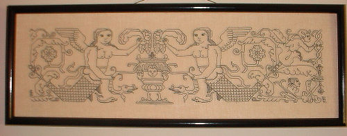 First – not everything that’s graphed out for double running can be done easily totally two-sided. Any design with an isolated bit of stitching that’s not connected to the main pattern presents a problem. The small dolphin just below the mermaid in the stitched panel above is not connected to the rest of the design. It’s a stand-alone element. To work this particular piece double sided, one would need to both begin and end off a separate strand of thread, just for that dolphin, or connect it on one or both sides to the main motif by one or more bridging stitches. Either way, the dolphin presents only a small problem. A larger one is posed by the mermaids’ facial features. The eyes, nose and mouth are isolated from the main stitching areas, and are too small to be worked double sided and have enough area to finish off the ends.