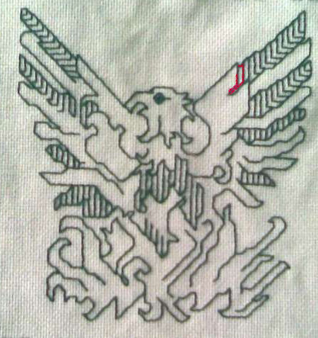The rest of the mermaid pattern can be worked double sided. There are no other logical impediments to completion. But how to work a complex design? Not hard. Any design without a discontinuity (like the orphan dolphin) can be envisioned as a single baseline, with detours to fill out the details or as a series of areas. Let’s look at the phoenix I posted here a couple months ago: