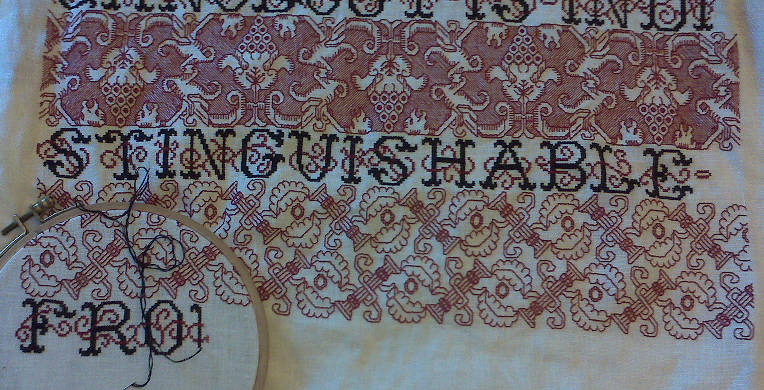 Another possibility would be a series of two-tone patterns, using both black and red in the same strip; or another long armed cross stitch band of a pattern similar in style to the one at the top, but worked voided. That would be very heavy though, and if done at all, should probably be relatively narrow. Maybe I’ll save that for the last one, to give weight to the bottom of the composition.