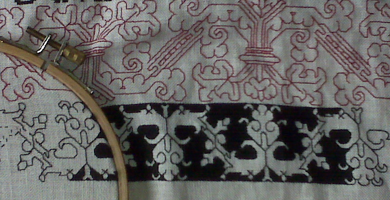 My sampler continues to grow. Here’s the progress on my latest strip. Filling in the background with long armed cross stitch does take quite a bit more time than does just working the outlines in double running: